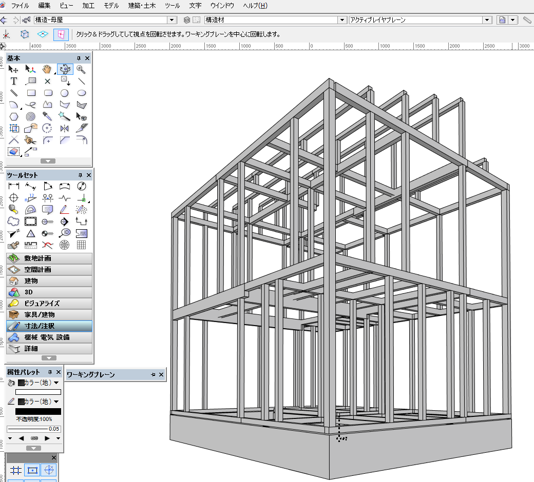 まずは軸組みツールを使って構造材を土台からモデリングしていきます。