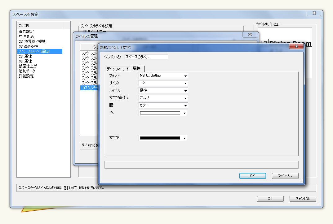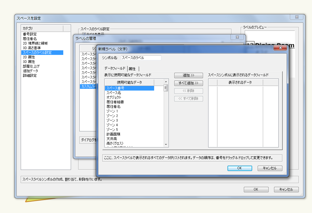 まずは、スペースを設定ダイアログから → ラベルの管理 → 新規ラベル(文字)と入って行き、データフィールドから表示させたいデータを選択し追加ボタンで追加します。
