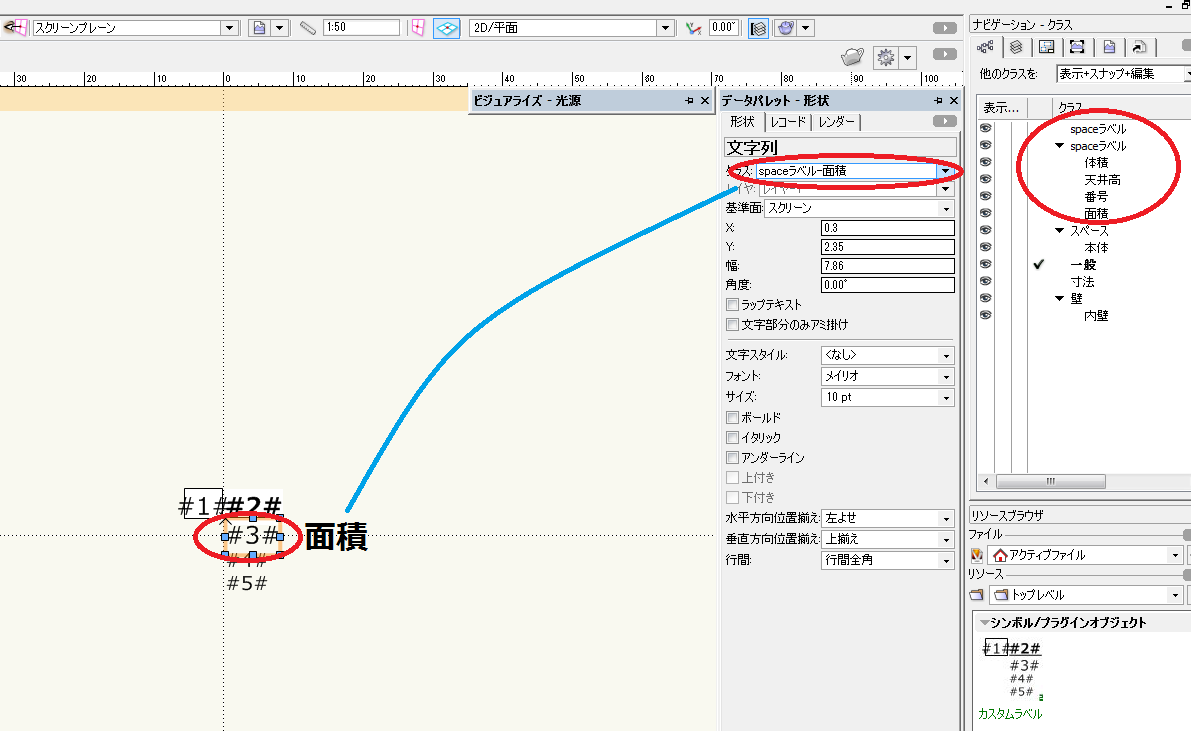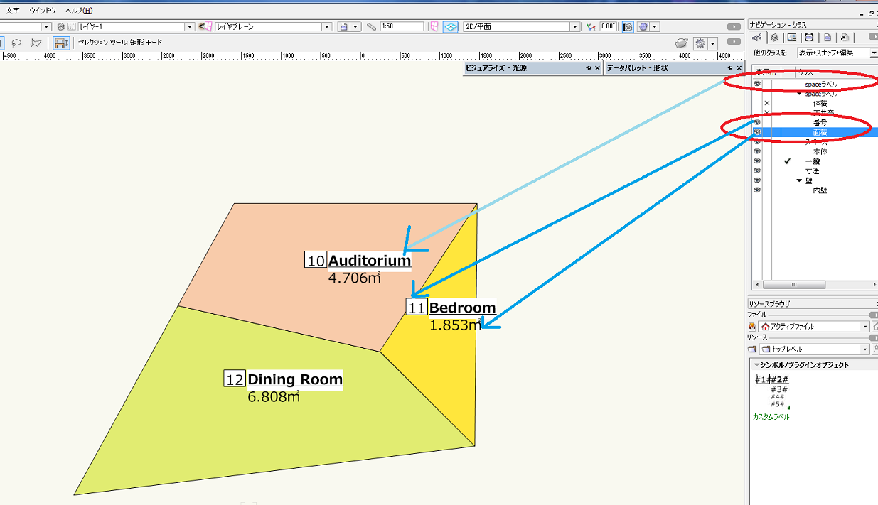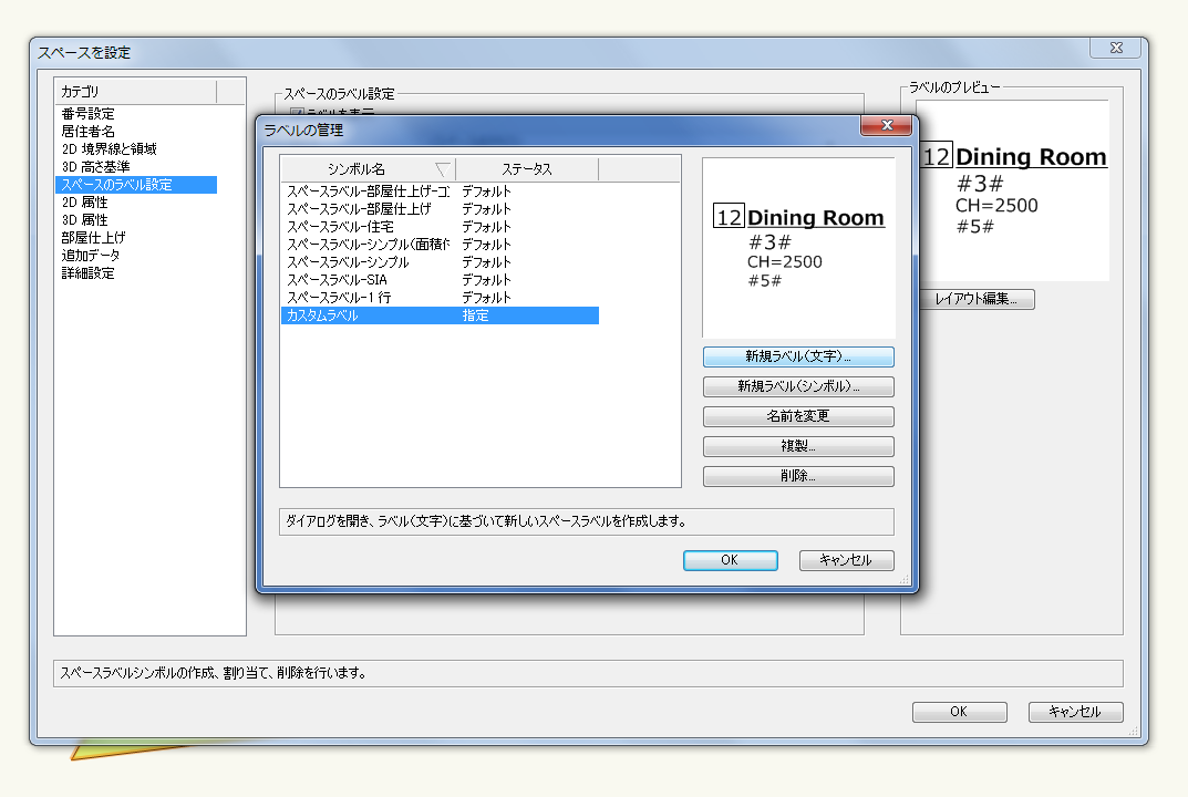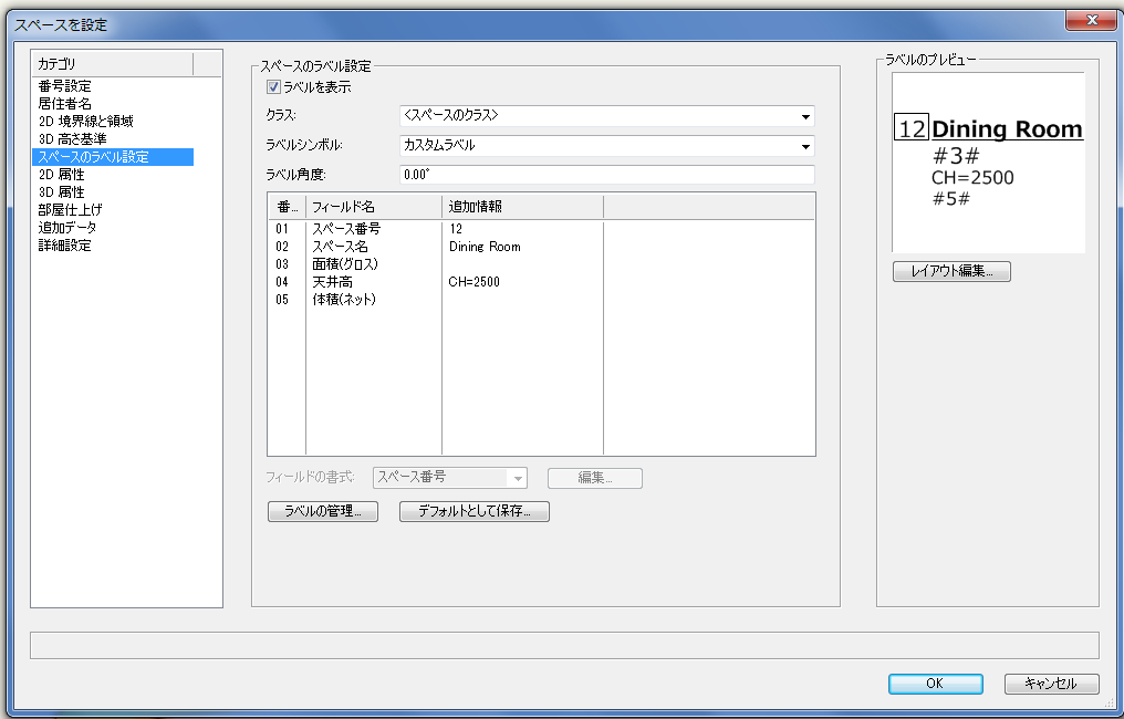僕はspaceラベル-番号 〃-面積 〃-天井高 〃-体積 そして名前はspaceラベル としました。