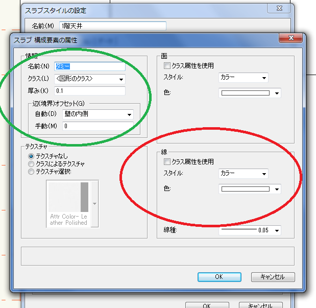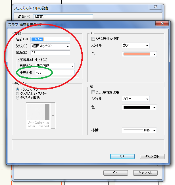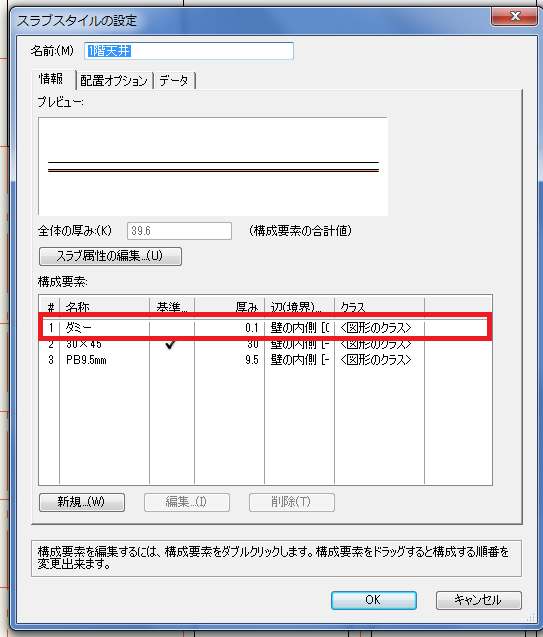 PB9.5mmは辺(境界)オフセットさせて壁の中に入り込まないようにします。ダミーはオフセット0とし中心線に沿って描く事ができます。その際設定で大切なのがダミーの厚さと色です。断面図に影響を与えにくいように、出来るだけ薄くカラーは白がいいような気がします。