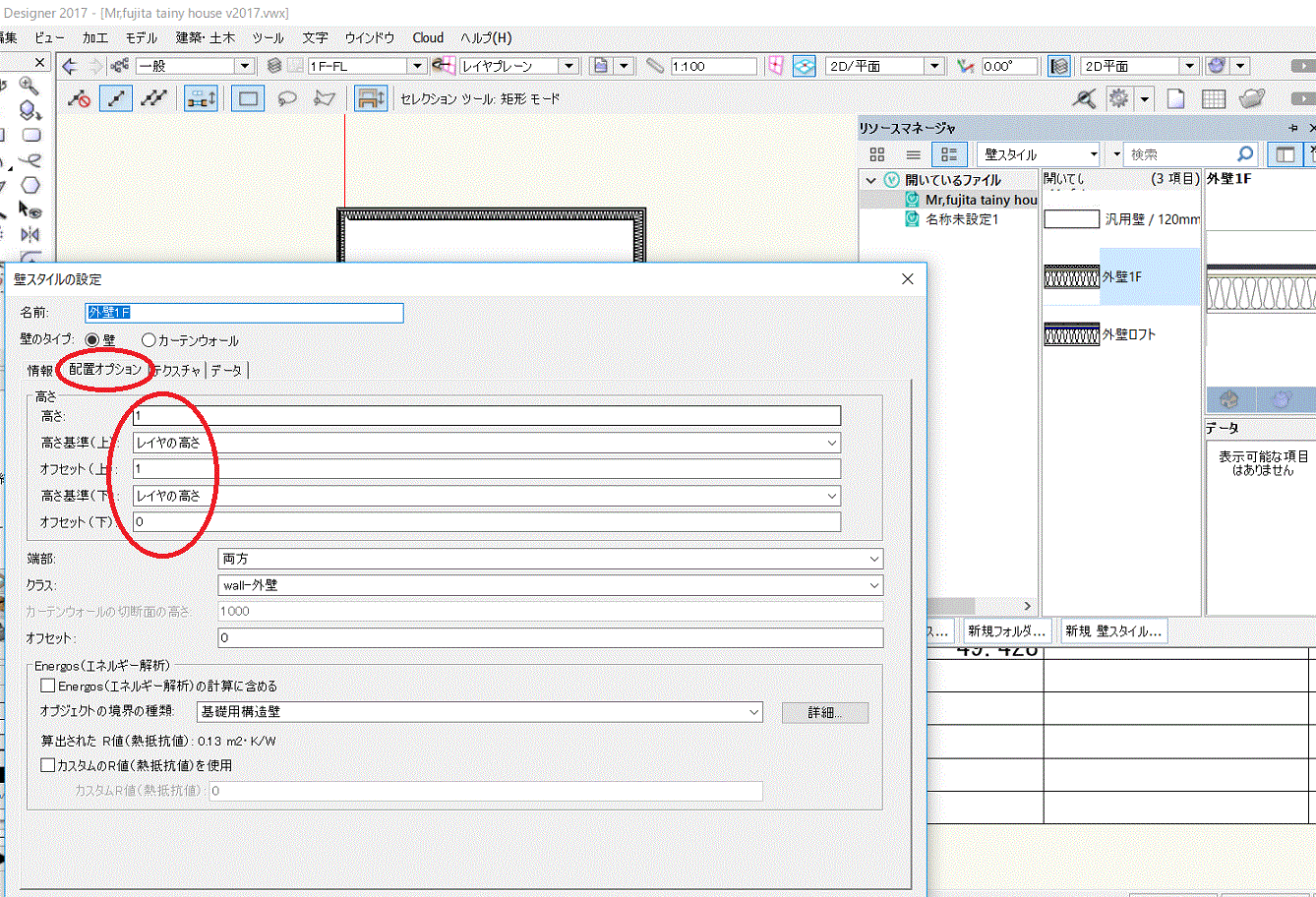 壁スタイル編集画面の「配置オプション」タグの高さの所に【高さ1】と入力してみました。