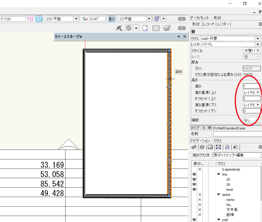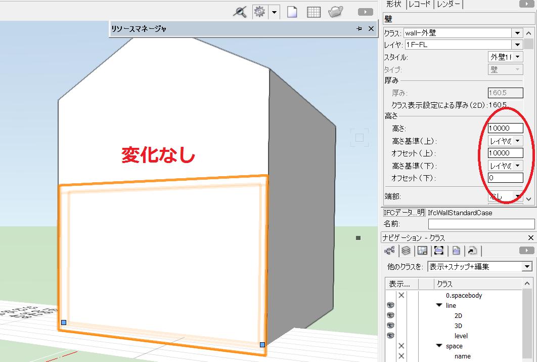 ちなみに高さ1としても、モデリングしている壁の高さは変わりません。以前にも書きましたが拘束力?がデータ配置オプションやパレットよりも壁スタイルでの設定の方が強いのです。もちろんデータパレットで高さを10000としても変化はありません。↓