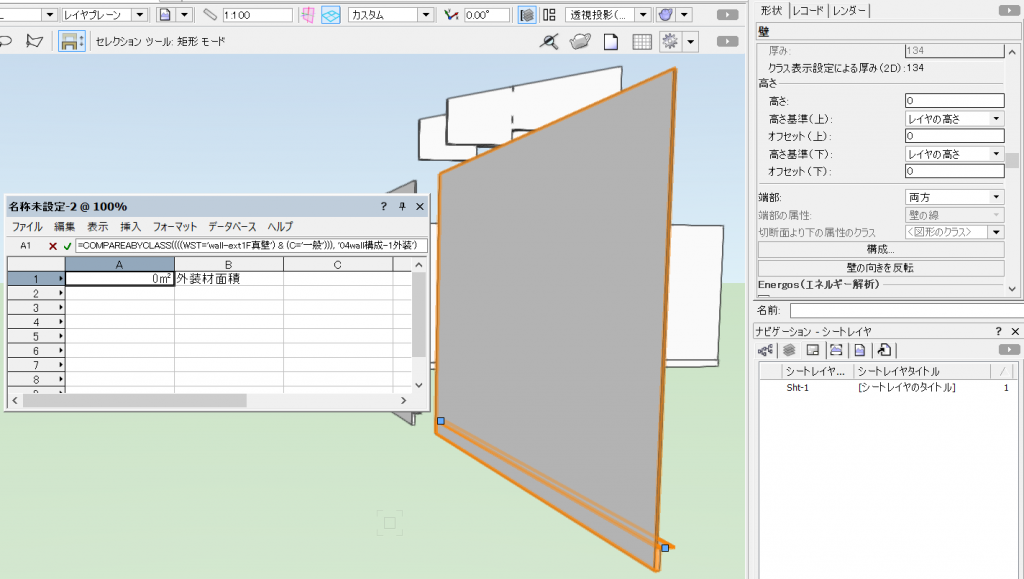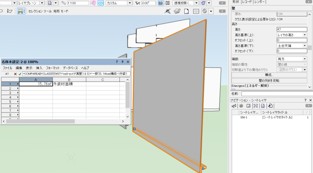 注意して見ていただきたいのは、外壁構成要素の形状と面積数値、そしてデータパレットの高さ数値です。
