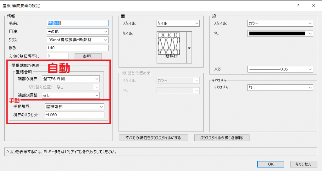 この場合、屋根構成要素の端部処理で、壁を屋根と連結させて自動処理するとうまくいきません。