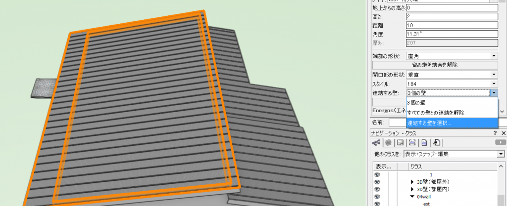 軒の出を調整したい屋根を選択し、データパレットの連結する壁から連結する壁を選択をチョイスします。