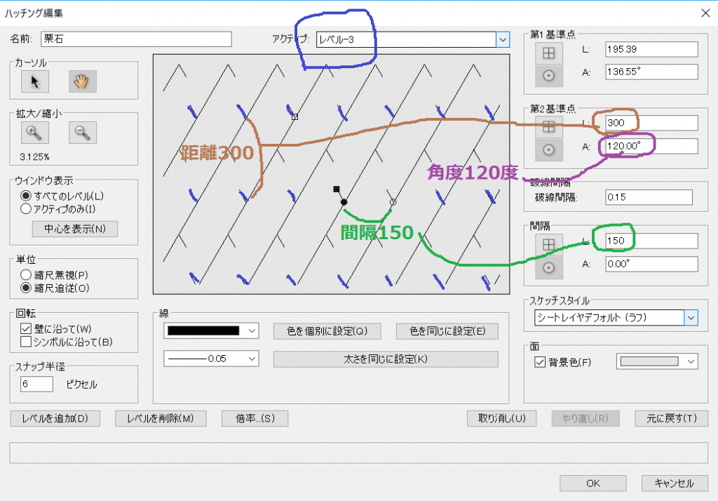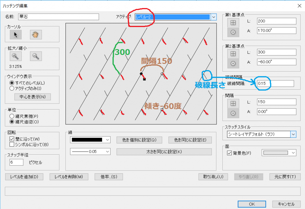 先ずはレベル1は斜めの実線で、角度は60度、実線間隔は150です。