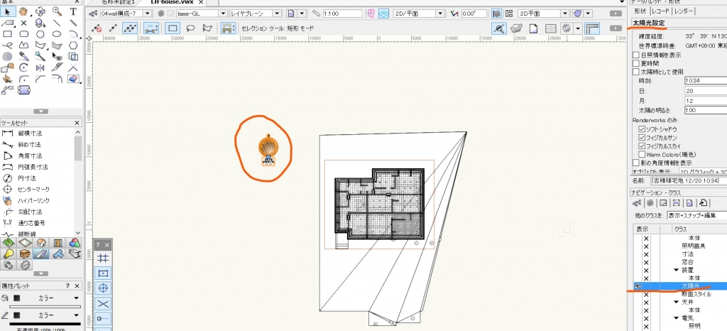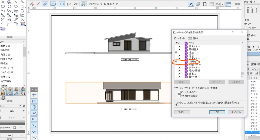 あとはシートレイヤデータパレットでビューポートクラスの太陽光クラスを表示にするだけです。