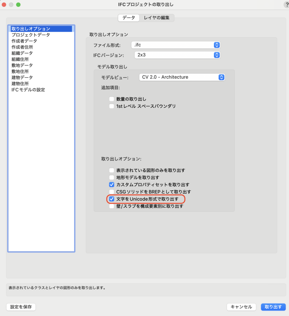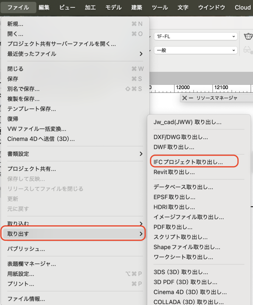 そのBIMモデルとはIFCデータとなっているので、vwxファイルをIFCデータとして取り出す必要があります。